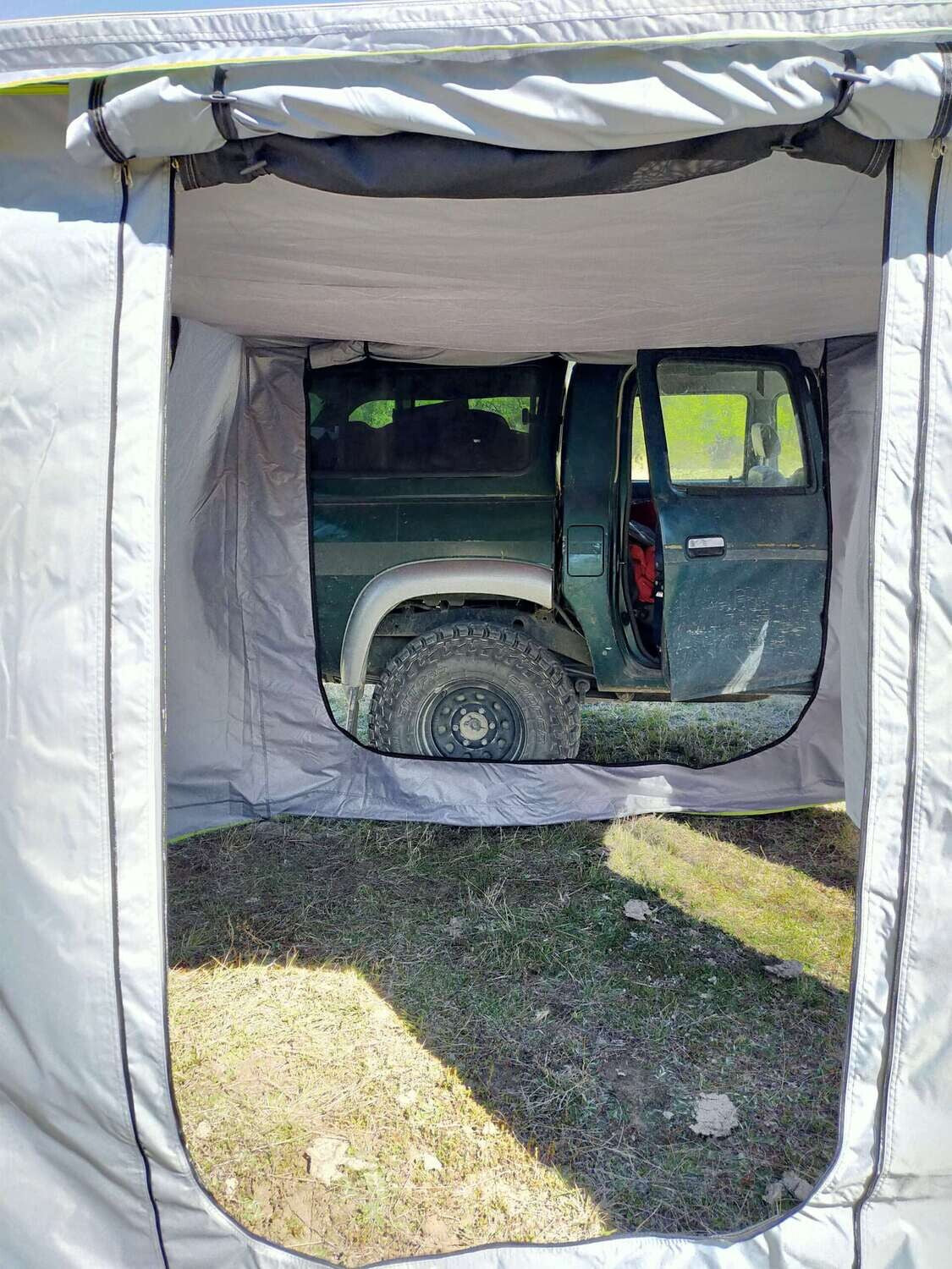 New fabric color is Black. With the standard size of 2.5m x2.5m, this universal wall-set / tent combo turns most square awnings on the market into an extra awesome space. Simply slide the back wall into the top rail of the awning frame, heavy duty zips along the outside 3 top edges and straps around the height adjustable poles, few ground pegs with a tight-rope and your sheltered room / tent is available within minutes of you pulling up the hand brake. The new version comes with a "ceiling" and turns your basic awning into a tent / suitable as extra bedroom. A quick and easy way to create a spacious room with plenty of fresh air and shade, but no annoying "flying" creatures joining you.