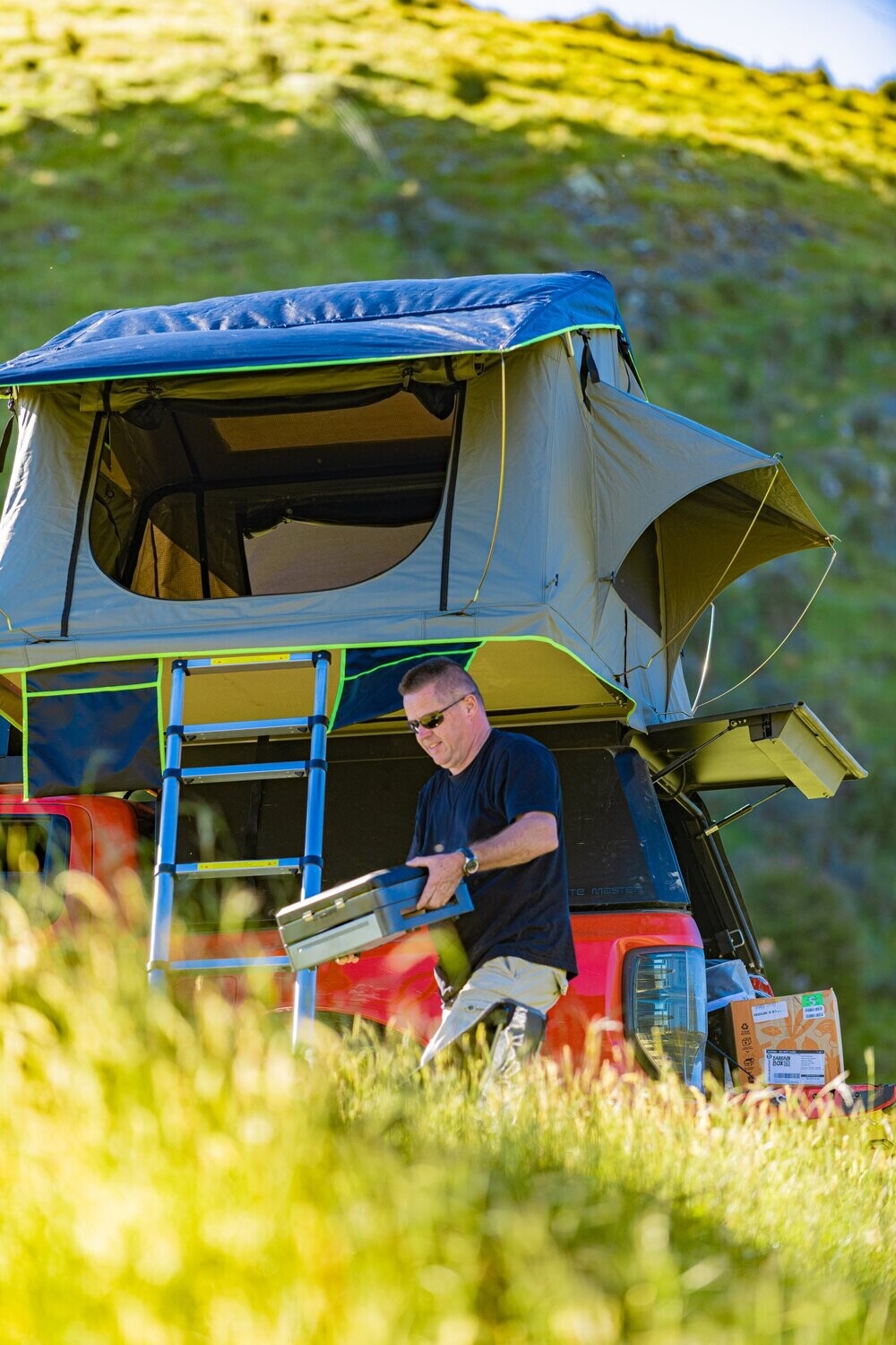 These new Gen4 roof top tents are based on nearly 5 years customers feedback, own camping experiences all year round and are therefor very well suited for NZ weather conditions. Queen Size mattress equivalent size Opened up your bed is 160x240cm and head height in the center is 120cm. Plenty of headroom for most of us. Suits 2 adults and a wee trooper with ease Closed up when traveling, the package is 163x123x30cm. Weight is 67kg (excl your sleeping gear inside) With the new and improved 320gsm rip stop fabric (high cotton %), upgrade floor panels, stronger internal 25mm wrapped curved poles (means less pooling in the rain) and more internal head space. The re-designed rainfly doesn't only look better, it reduces wind flapping noise too. Better waterproof coating and a few more of the smaller design features makes these new GEN4 tents stack up rather well against the other brands out there! Great quality doesn't has to be more expensive .... With a standard package that includes a 2.3m multi level telescopic long ladder, a 70mm MHD memory foam mattress, a skylight and a pair of shoe bags, you can see why it sets the tents from Perfect Pitched Ltd apart from the others.