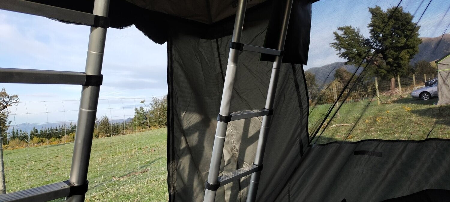 A quick and easy attachment to the underside (front half) of your E model roof top tent. This size is getting up there in additional space... Top is 160cm wide (as your tent), tappers out at floor level to approx. 180cm whilst from front to back you have nearly 2.1m in length. Complete with front and rear door, side windows and mosquito mesh on all openings and heavy duty PVC zip in floor...